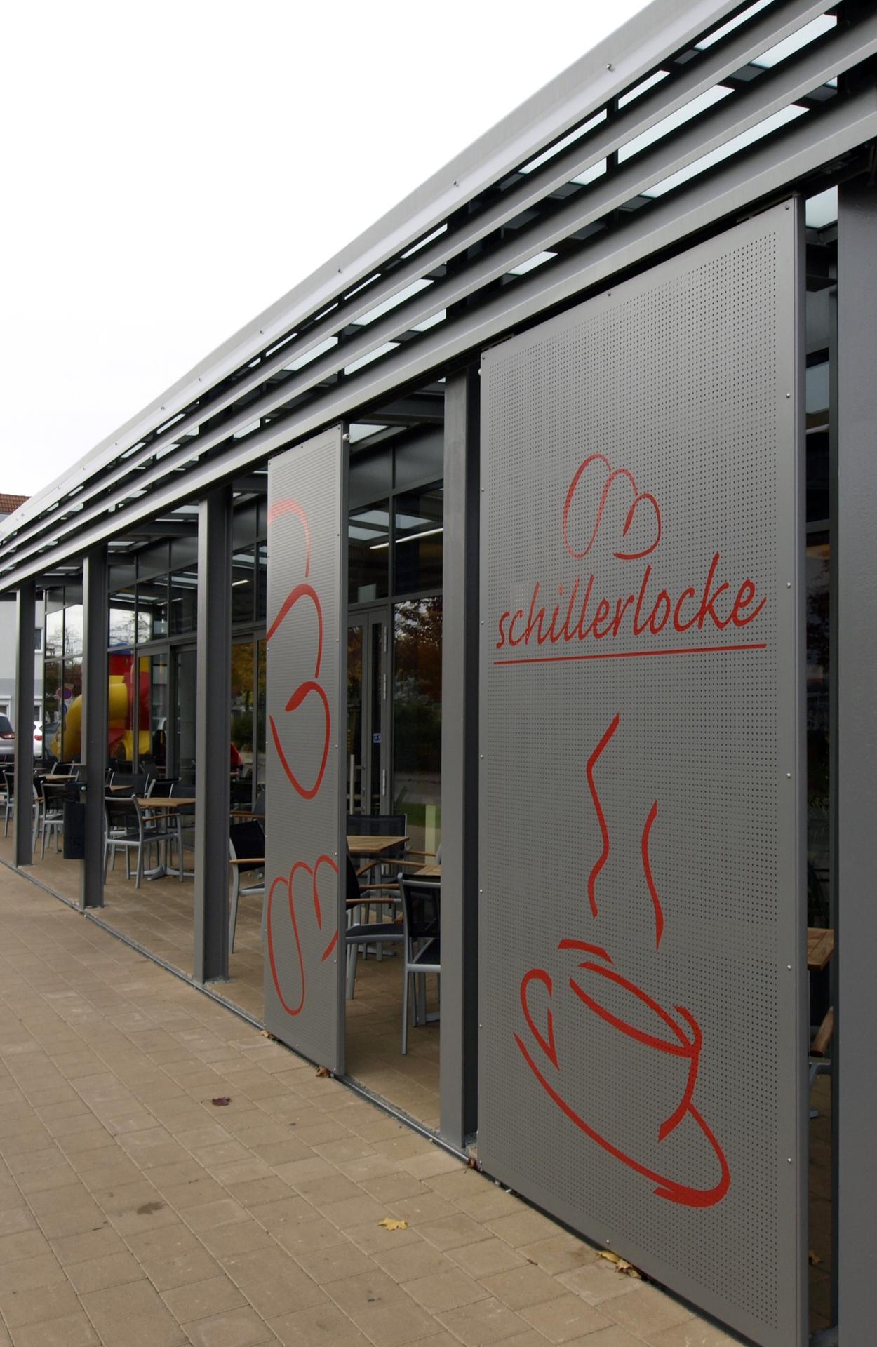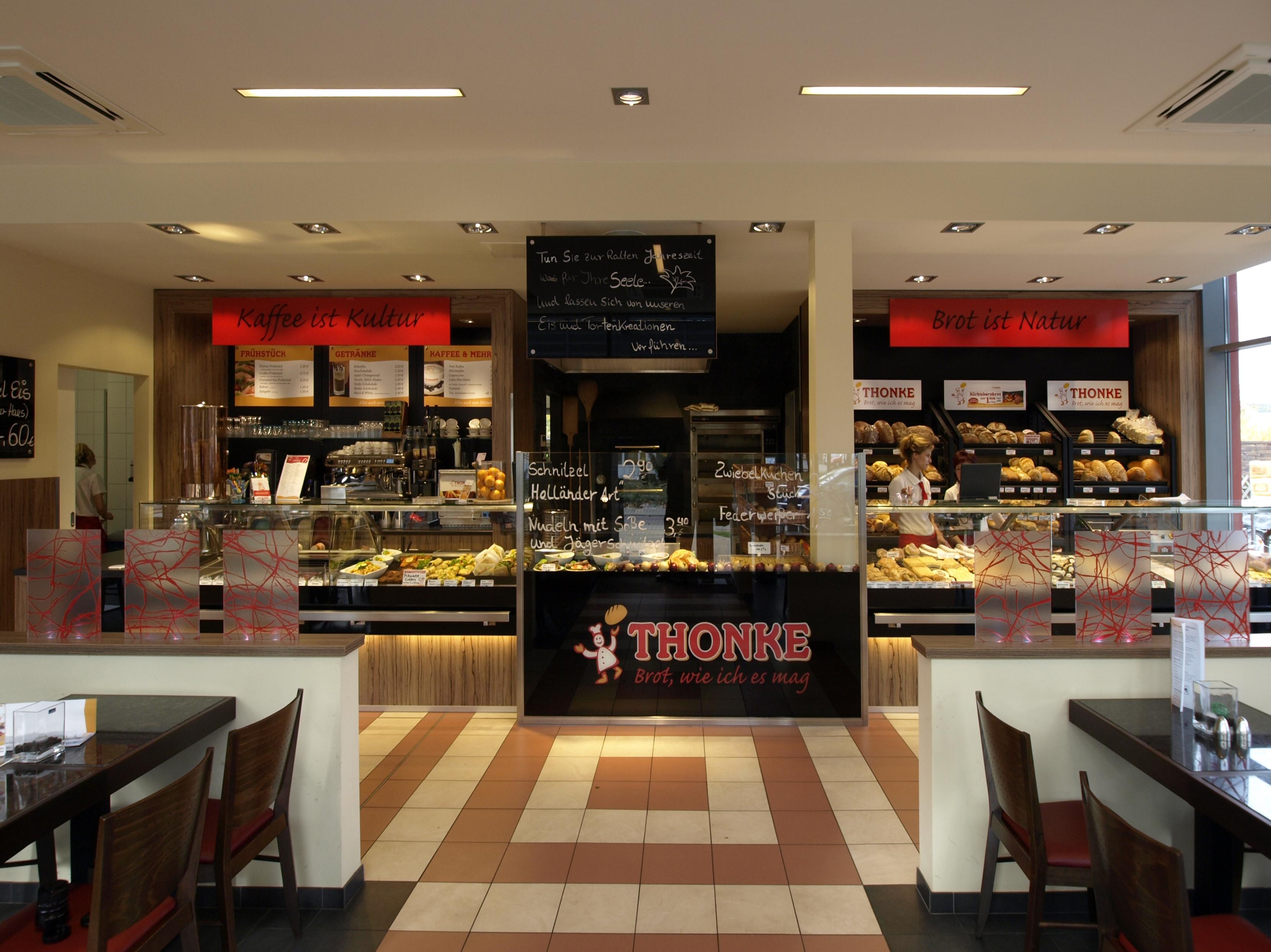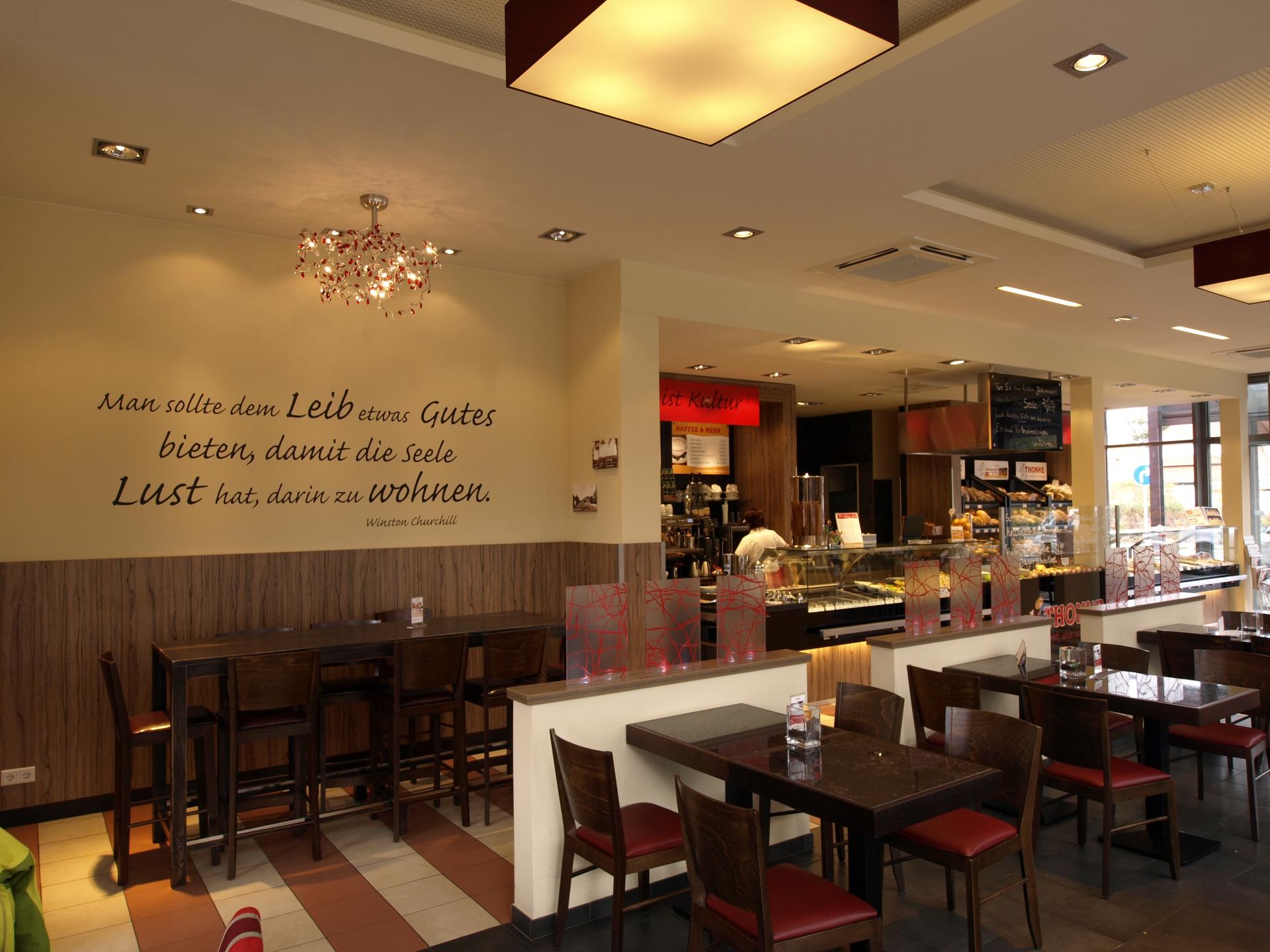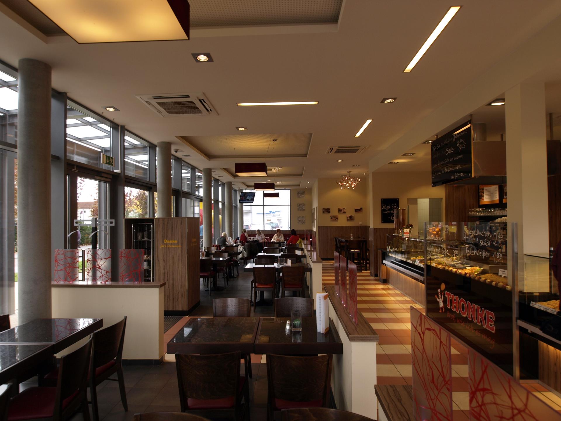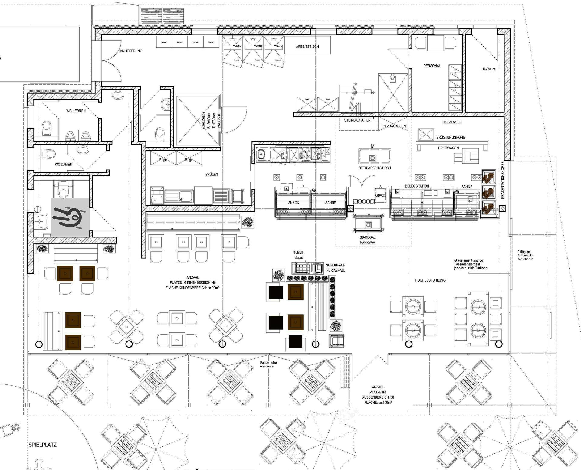 Café und integrierter Backwarenverkauf, 45 Sitzplätze im Innenbereich und 36 im Außenbereich.