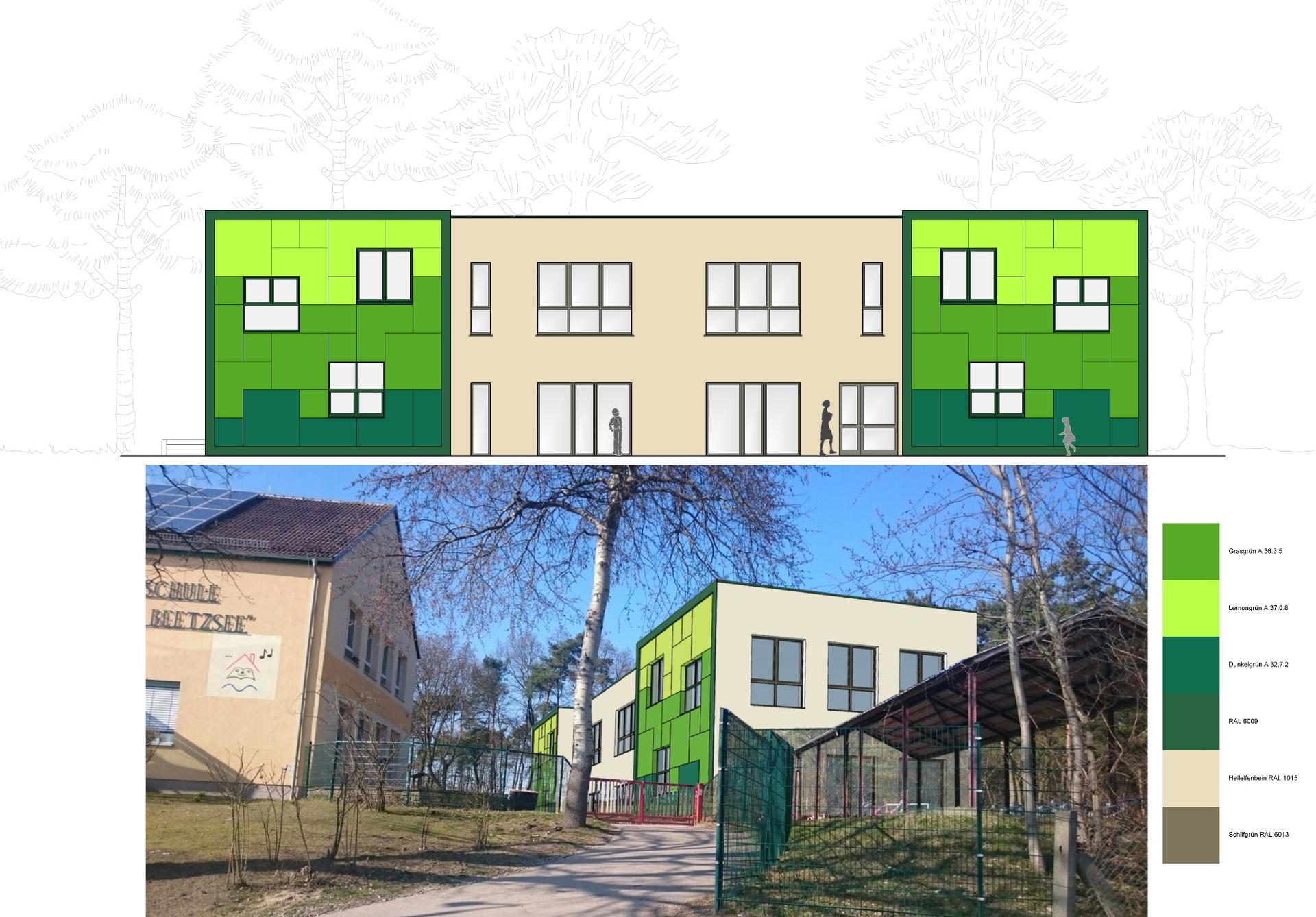 Neben dem bestehenden Schulgebäude wird auf dem Schulgelände ein separater Neubau über 2 Geschosse errichtet, mit 3 Flex-Klassenräumen, einem Fachraum für Musik/ Kunst, einem WAT-Raum und einem Teilungsraum, der bei Bedarf durch eine halbautomatische Schiebewand in zwei Räume gegliedert werden kann. Desweiteren beinhaltet der Neubau die WC-Anlagen und Vorbereitungsräume.