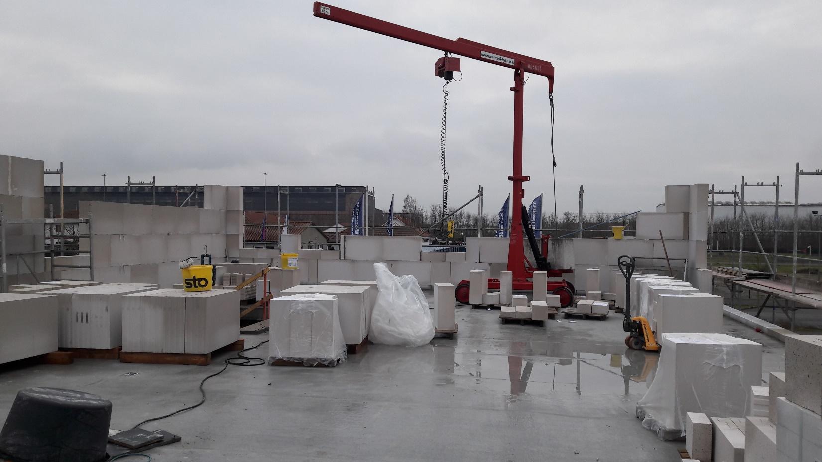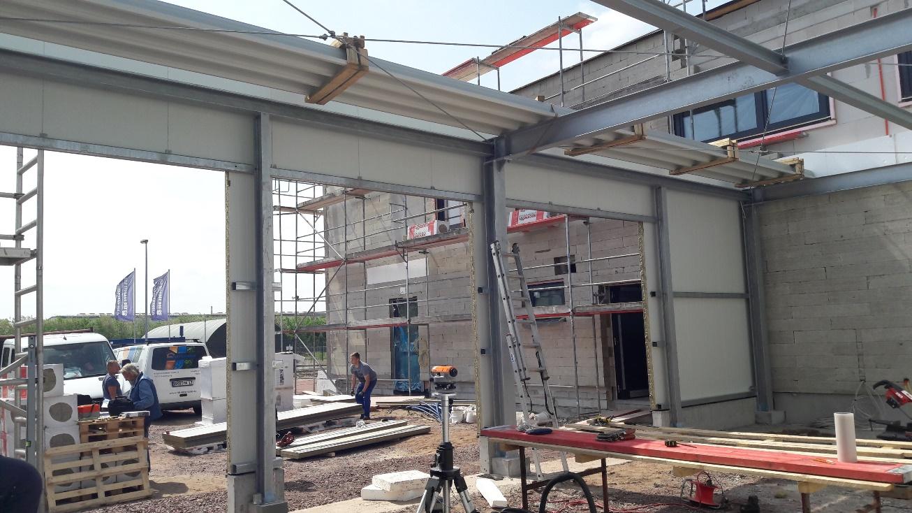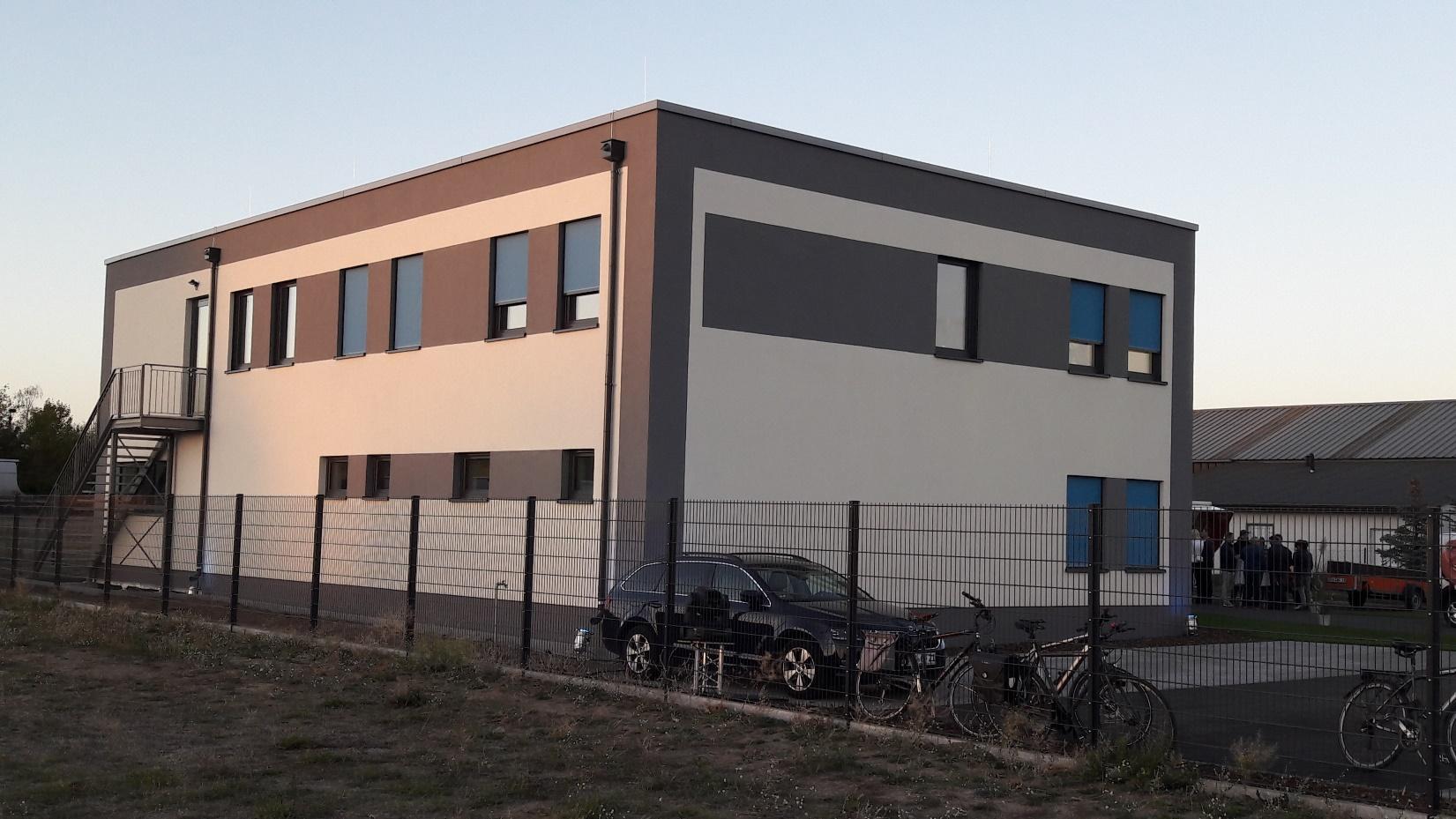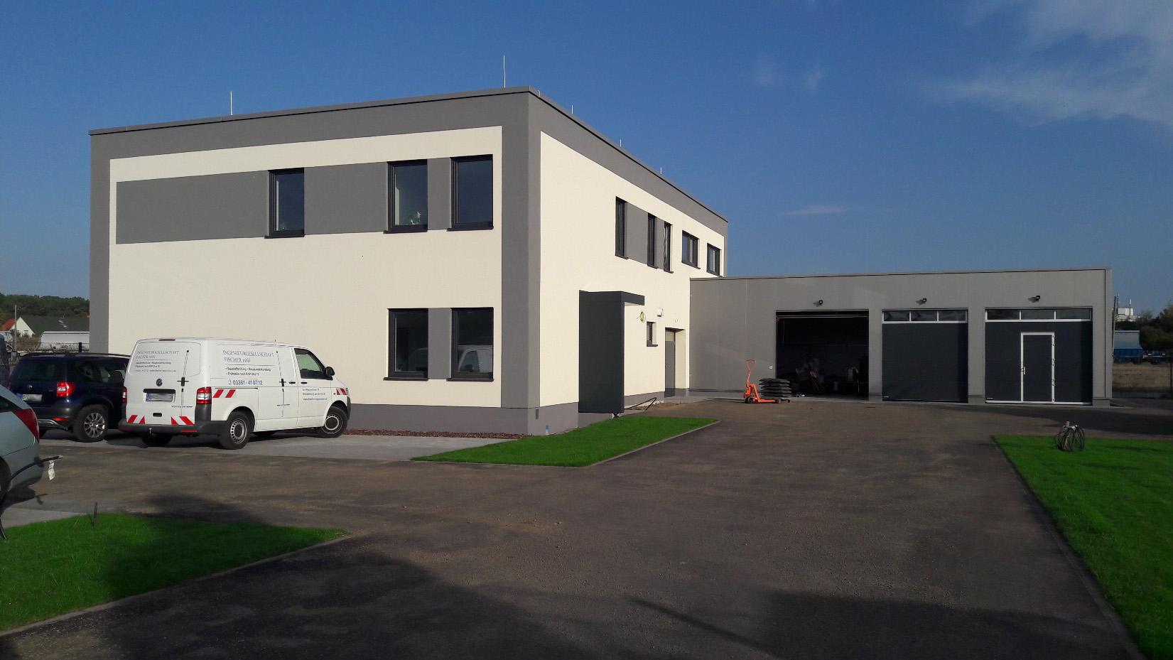 Der Neubau besteht aus einem 2-geschossigen Massivbau aus Kalksandsteinmauerwerk mit einem aufgebrachten WDVS in welchem sich der Büro- und Laborbereich befinden und einem 1-geschossigen Hallenbau aus einer Stahlrahmenkonstruktion mit Metallverkleidung, welcher als Garage benutzt wird.