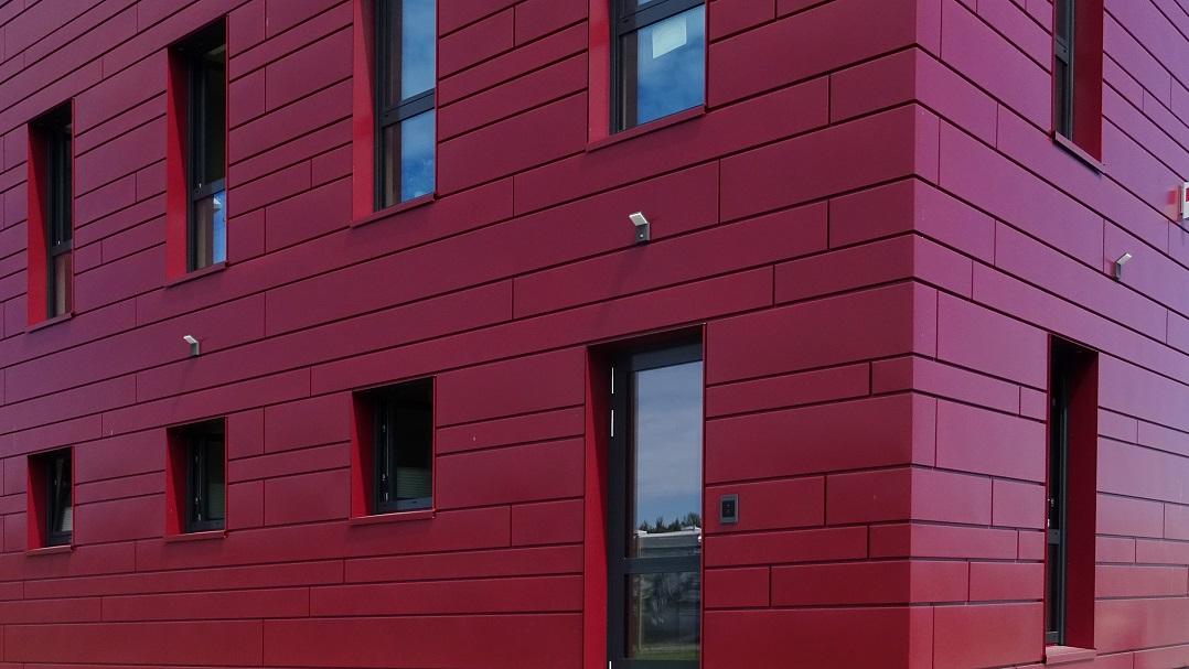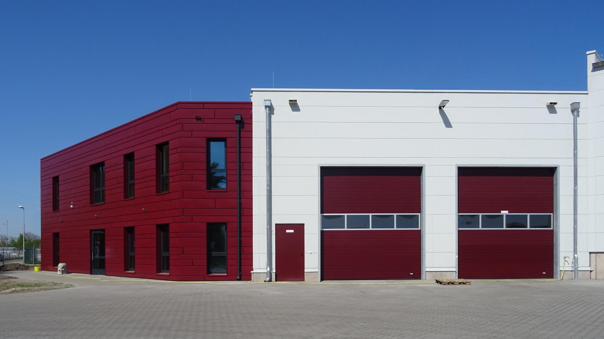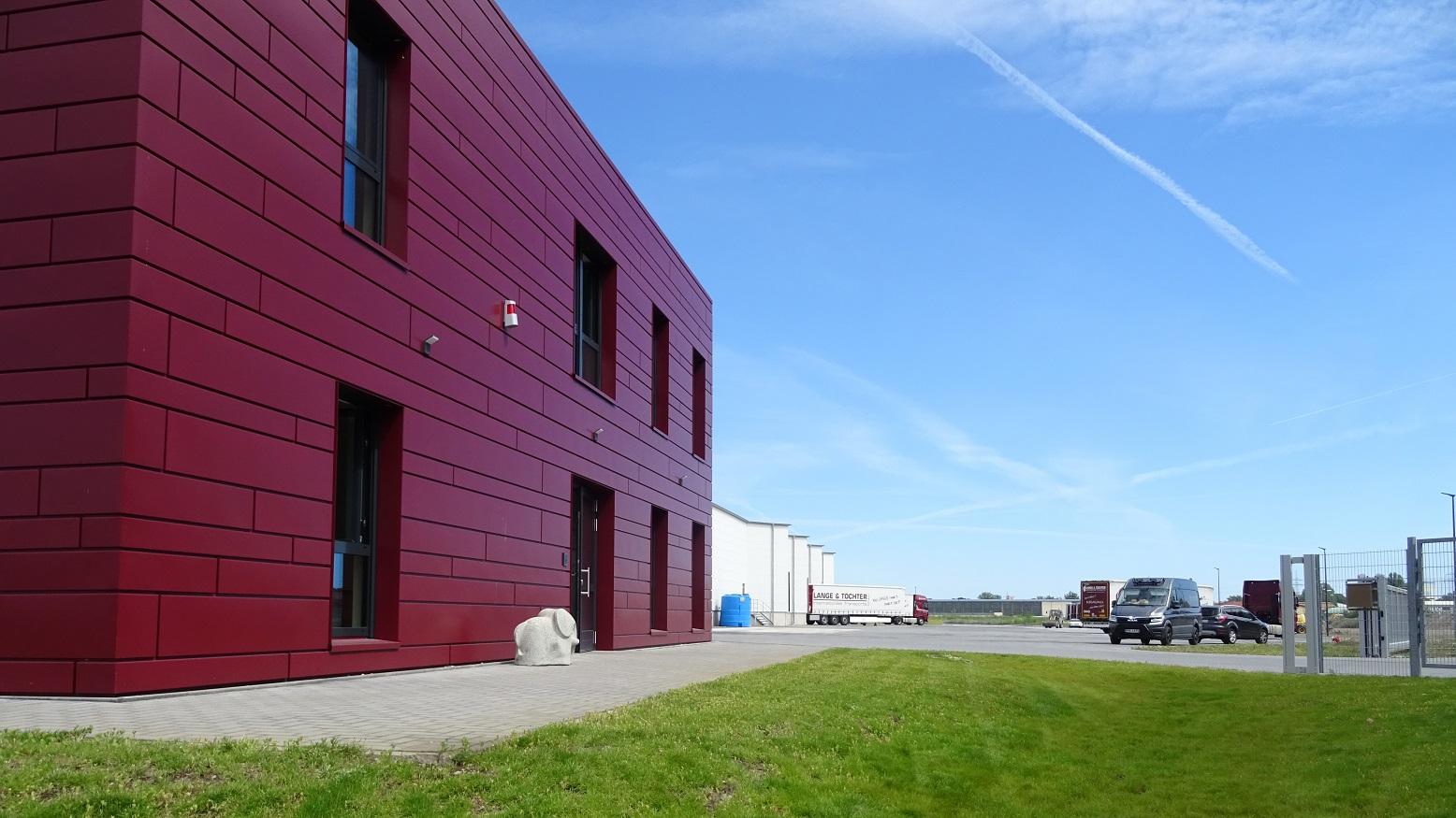 Das Verwaltungsgebäude ist als Massivbau aus Kalksandstein-Mauerwerk und Stahlbeton mit vorgehängter Steckpaneel-Metallfassade im Farbton des Unternehmens ausgeführt.