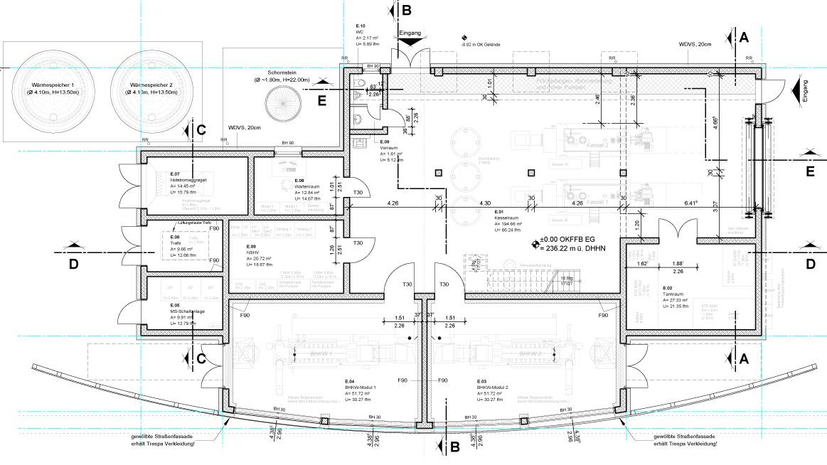 Um die gesamte Peripherie (Nieder- und Mittelspannung, Trafo, BHKW-Module 1+2, Kesselhaus, Lüftung, Steuerzentrale, … etc.) im Gebäude unterzubringen, ist eine Gebäudegrundfläche von ca. 476m² notwendig.
