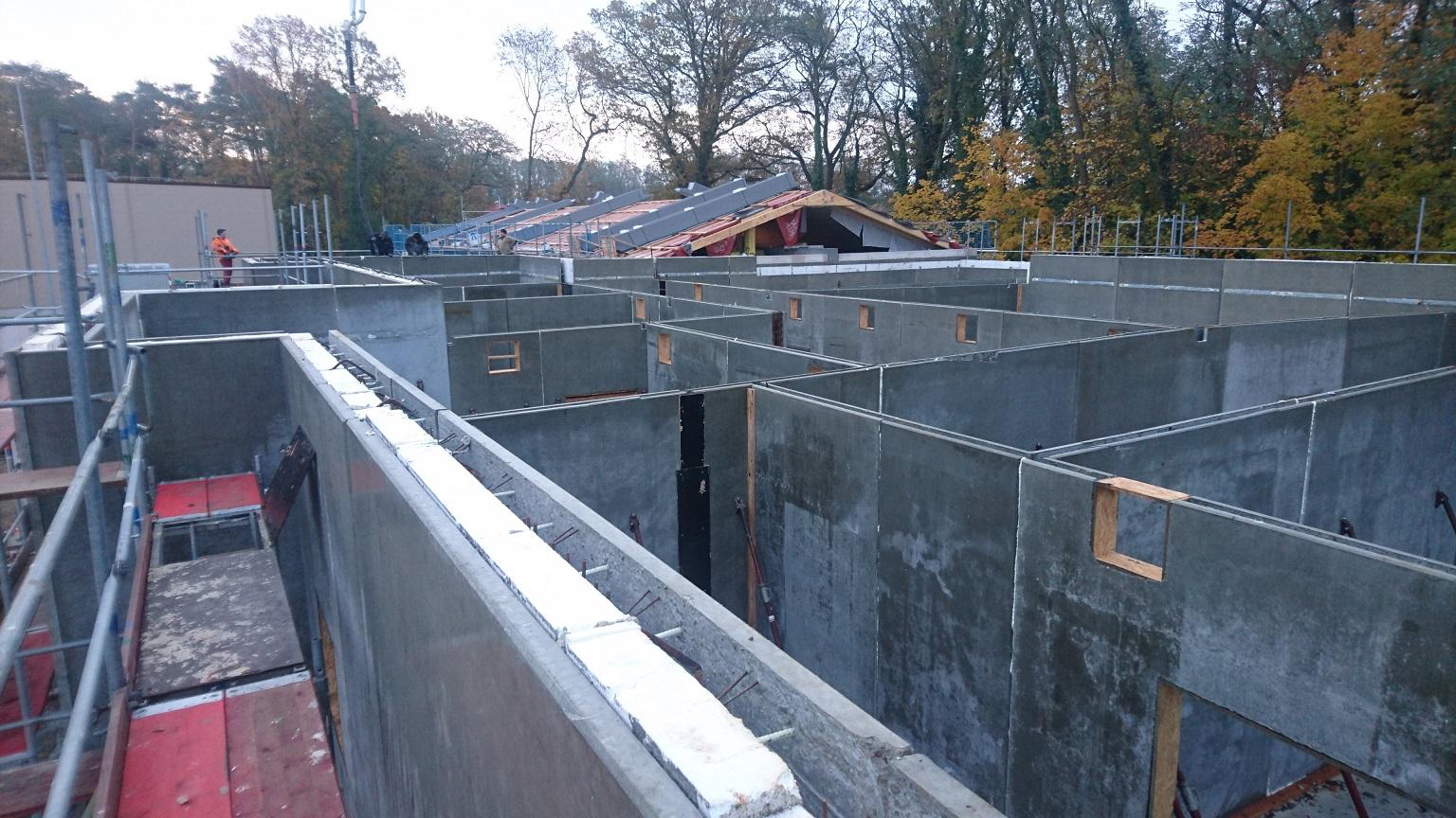 Die Tragkonstruktion der Werkstatt besteht aus vorgefertigten Stahlbetonfertigelementen mit integrierter Dämmschale in den Außenwänden.