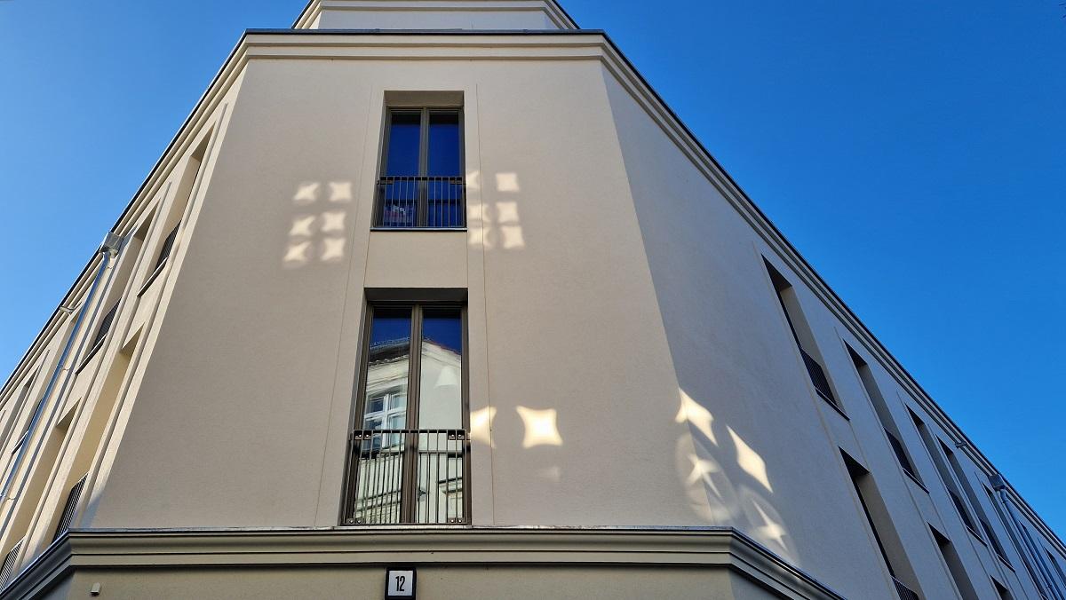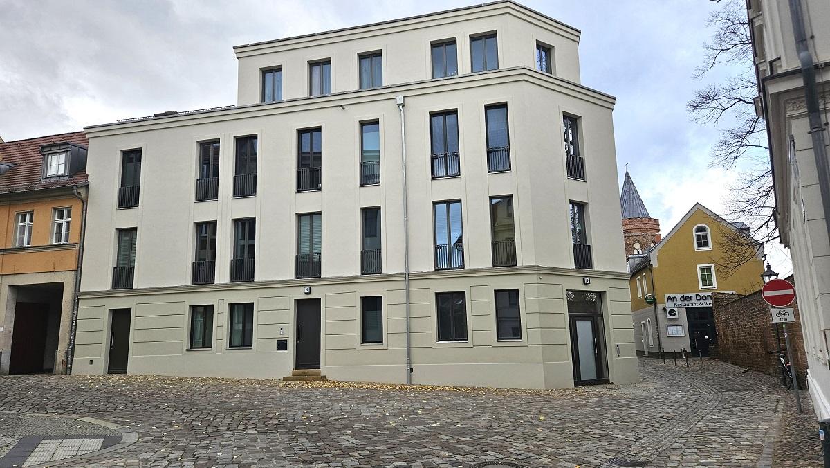 In der Innenstadt von Brandenburg an der Havel zwischen Bestandsgebäuden und in der unmittelbaren Nähe von Denkmälern entstand ein 4-geschossiger Neubau. Das oberste Geschoss springt als Staffelgeschoss zurück, die Straßenfassade ist deutlich gegliedert mit Gurtgesims, oberes Abschlussgesims, Fensterumrahmungen und horizontalen Trapezprofilen als nachgebildeter Bossenputz.