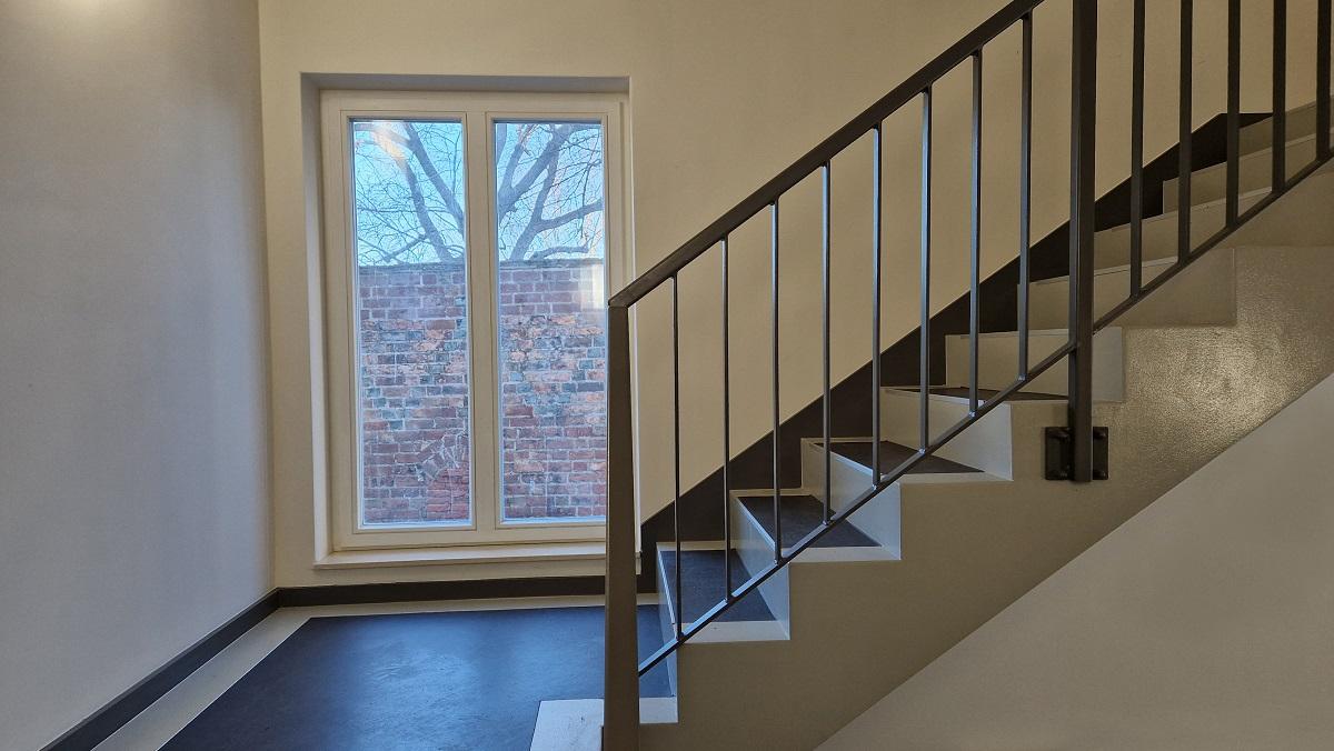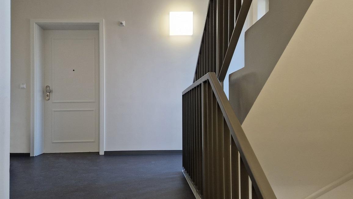Das Gebäude ist unterteilt in 10 Wohneinheiten mit 2- bis 4-Raumwohnungen und in zwei Treppenhäuser, eines mit Aufzug zur barrierefreien vertikalen Erschließung .
