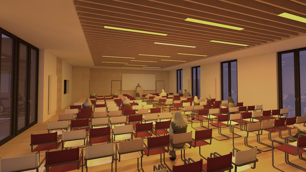 Ziel des Neubaus soll primär die Schaffung eines Speiseraumes für 96 Personen mit Ausgabeküche (Cook & Freeze) bzw. einer Aula für 199 Personen mit Technikraum und Stuhllager sein. Für den Aula- Bereich ist ein großer stützenfreier Raum erwünscht, welcher für besondere schulische Veranstaltungen genutzt werden kann. Da für die Nutzung als Mensa eine kleinere Fläche ausreichend ist, soll der große Raum mittels einer mobilen Trennwand unterteilt werden. Somit ist eine flexible und parallele Nutzung der Räumlichkeiten möglich.