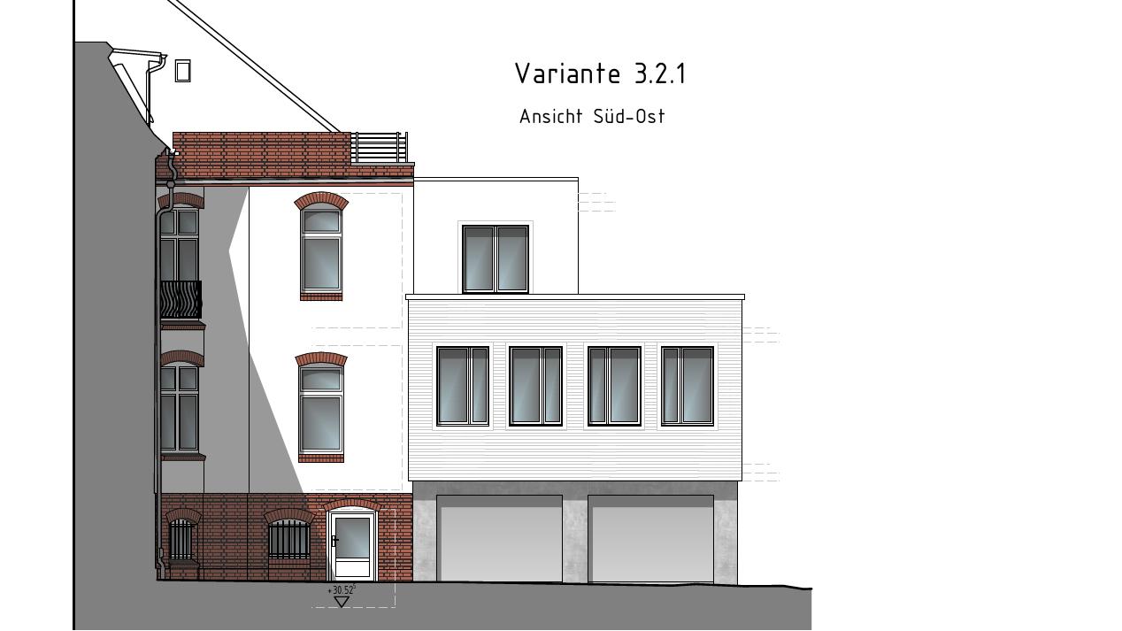 Im Bestand vorhanden ist das straßenseitige vollunterkellerte Vorderhaus mit in Hochparterre befindlicher Zahnarztpraxis und im Ober- und Dachgeschoss gelegener Wohnung des Arztes.